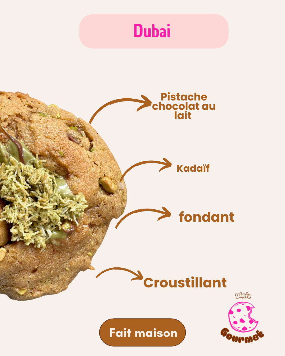Un cookie généreux et moelleux, enrichi de chocolat fondant et de pistache croquante, inspiré des saveurs luxueuses du Moyen-Orient.